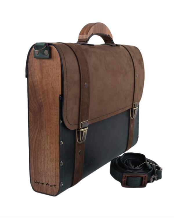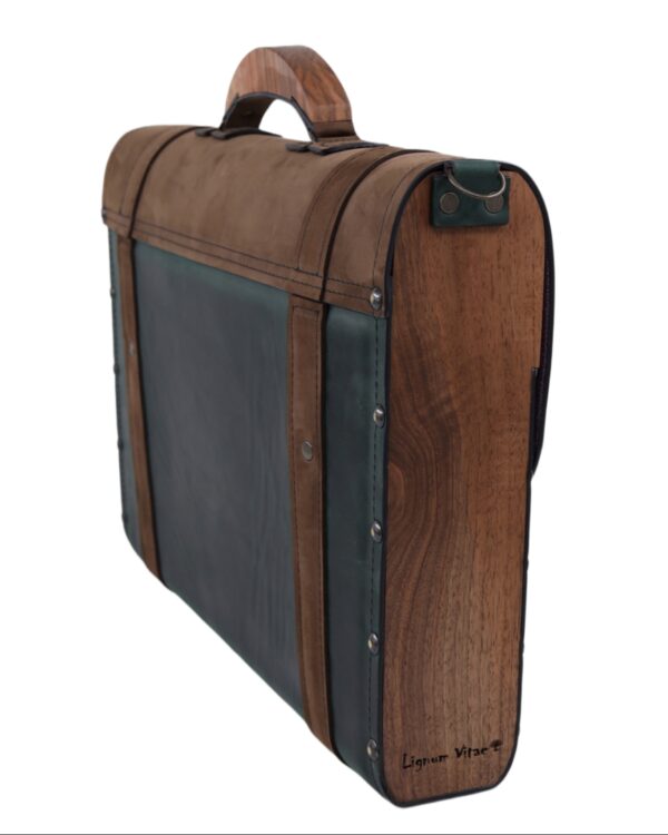 Izradjena je od najfinije, reljefne Italijanske kože i odabranih komada drveta oraha na stranicama i ručici. Ostali materijali su metalne bravice, alkice i ekserici.