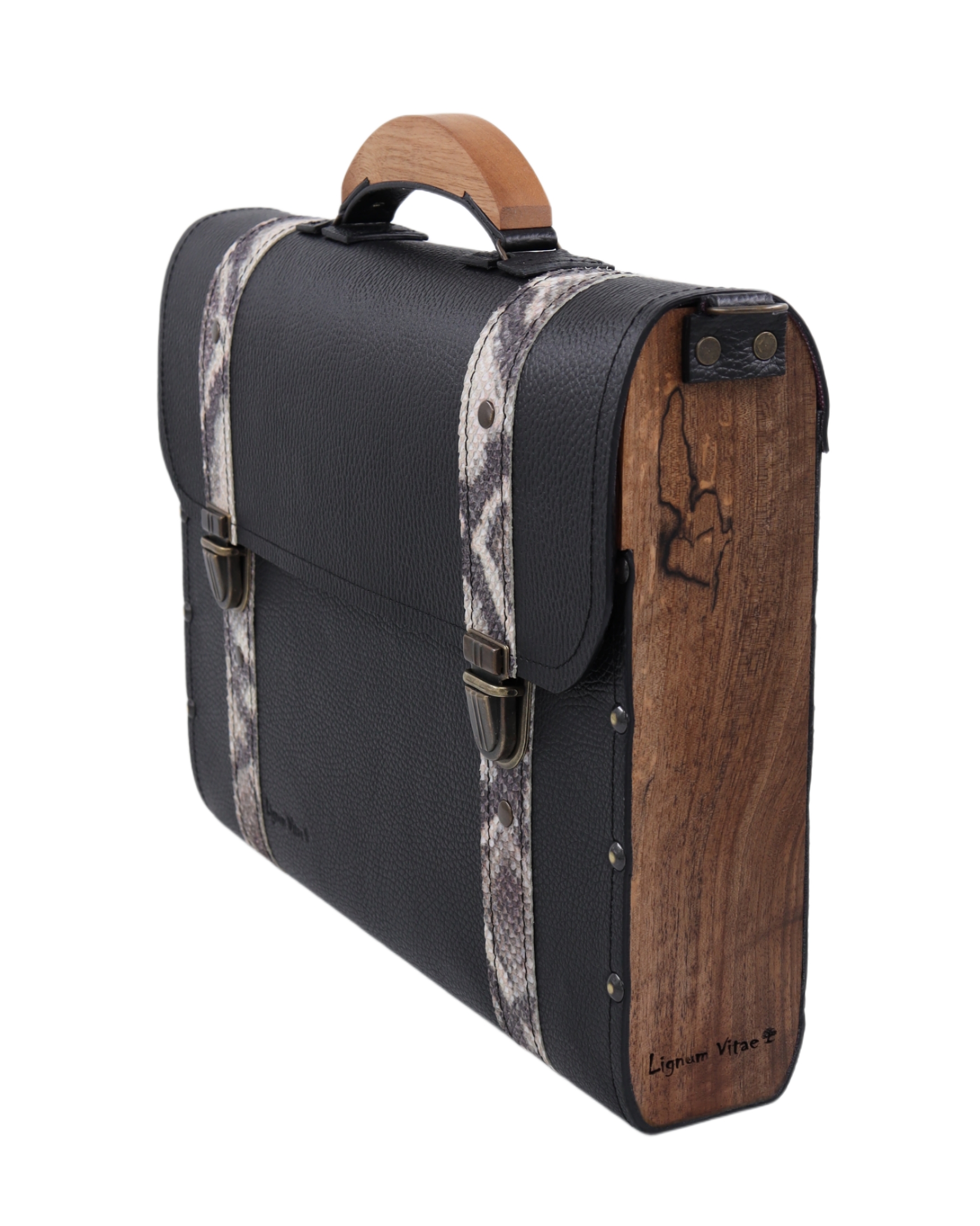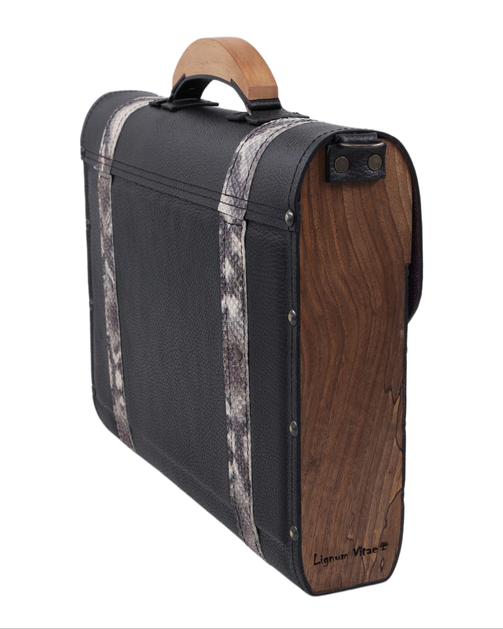 Izradjena je od najfinije, reljefne Italijanske kože i odabranih komada drveta oraha na stranicama i ručici. Ostali materijali su metalne bravice, alkice i ekserici.
