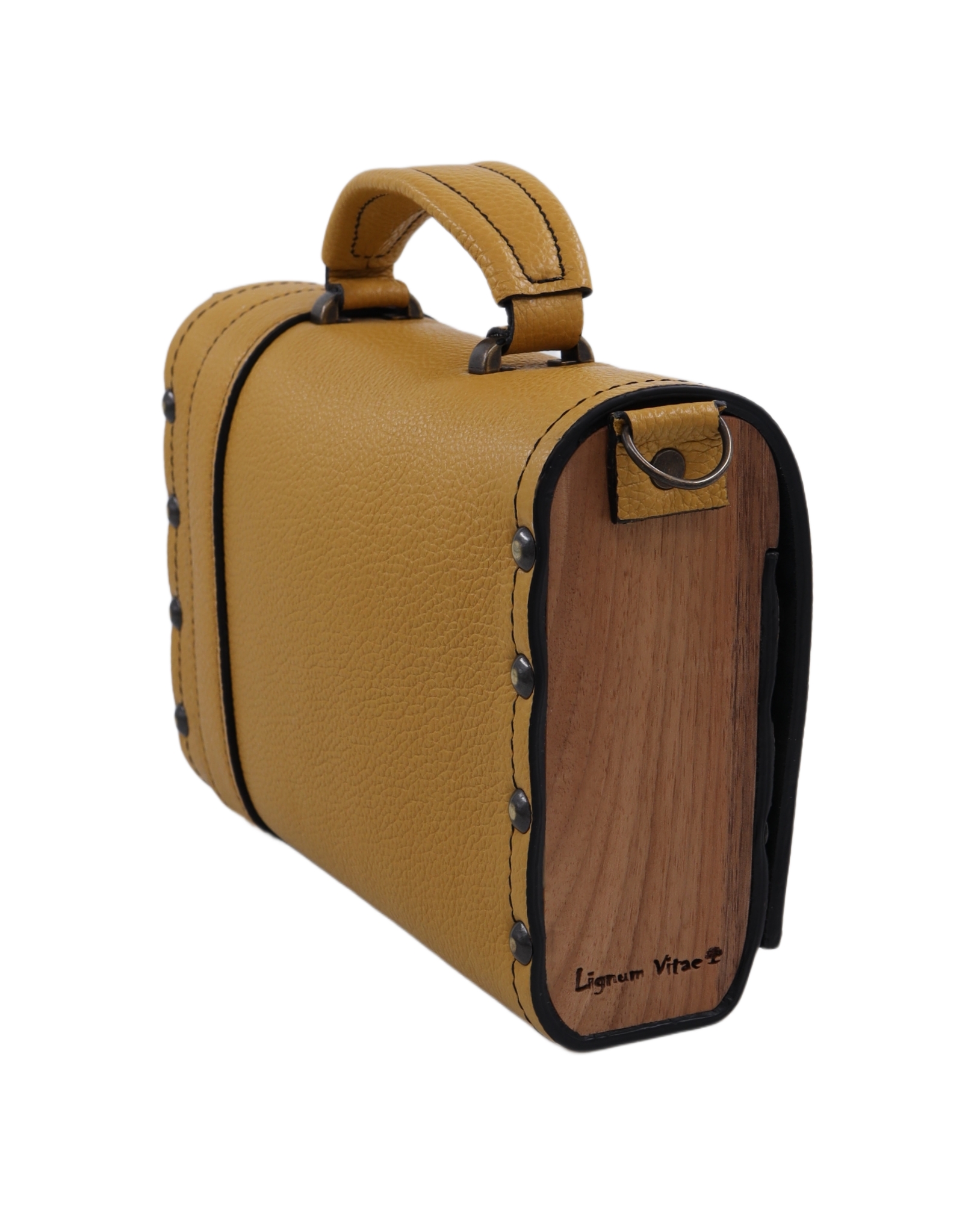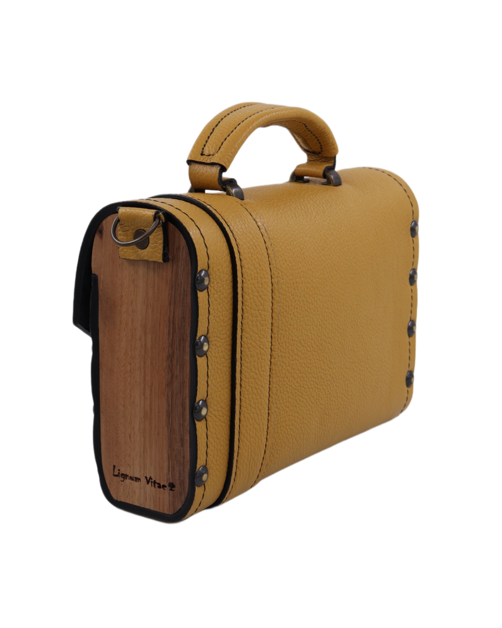 Mini remek delo iz naše radionice. Izrađena od prirodne kože i drveta torba sa kožnom ručicom koja daje njenom obliku dodatnu dimenziju. Unutrašnjost torbe je postavljena kožom a uz nju ide kožni kaiš sa našom tradicionalnom drvenom šnalom za podešavanje dužine . Stranice su izrađene od ultra-lakih komada finog orahovog drveta u veličini dovoljnoj za vaše osnovne stvari.Za sve ljubitelje malih torbica Ophelia je pravi izbor.