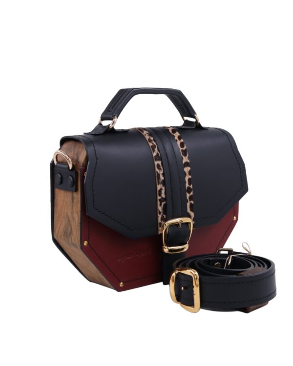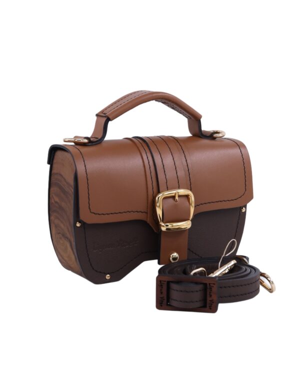 Izradjena je od najfinije, glatke Italijanske kože i komada drveta oraha na kopči. Ostali materijali su metalna bravica, lanac i karabinjeri.