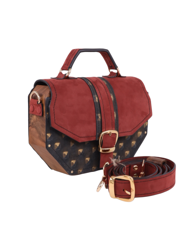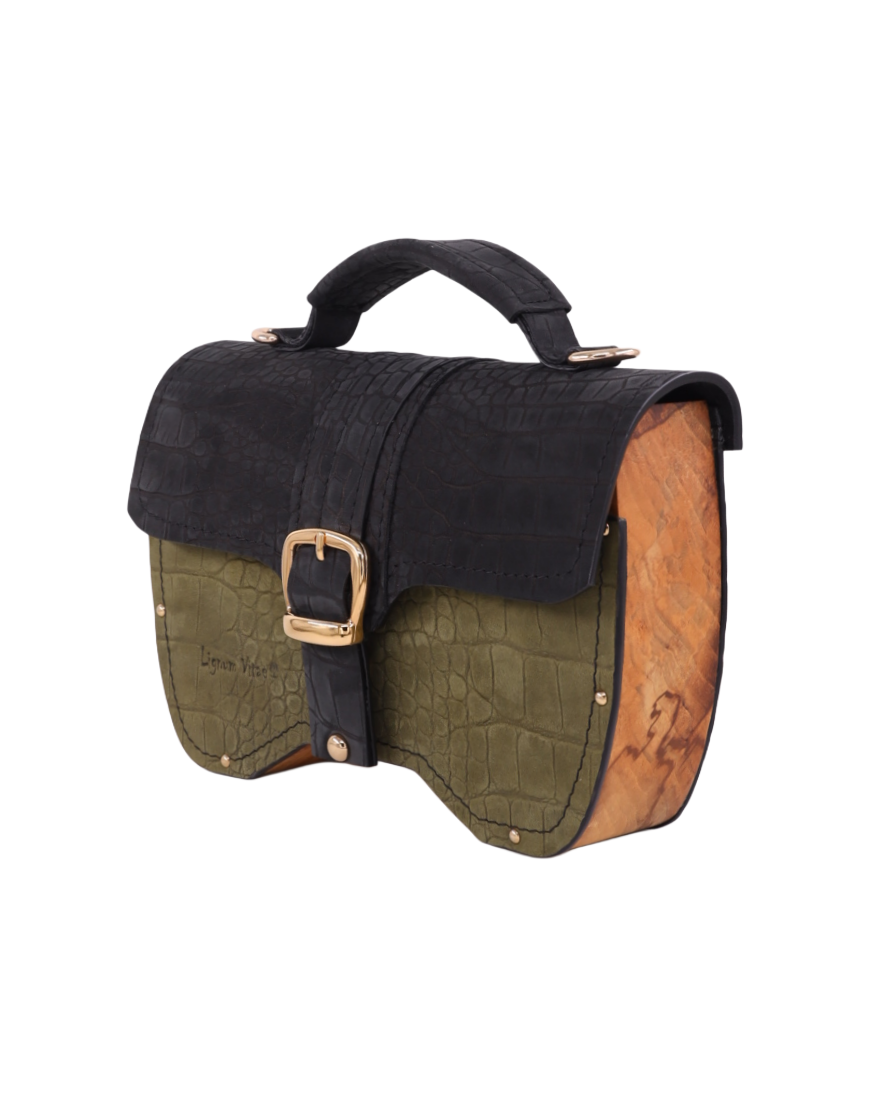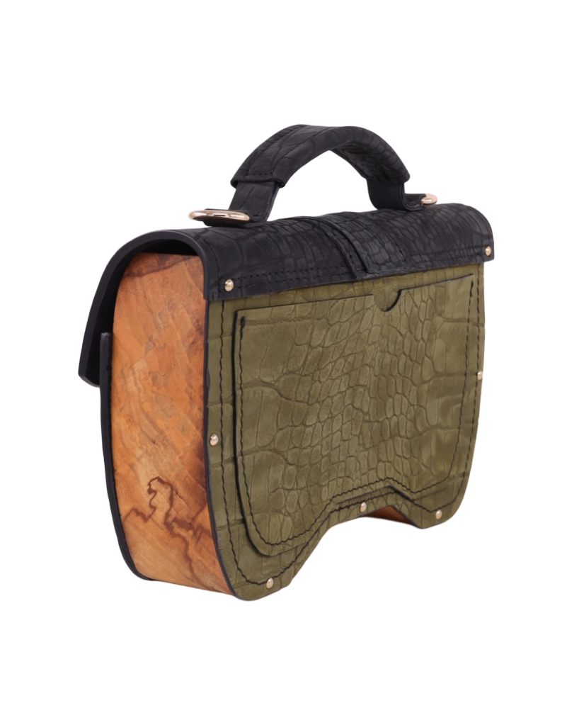Izradjena je od najfinije, kroko Italijanske kože i komada drveta oraha. Ostali materijali su metalna bravica, šnala i ekserici.
