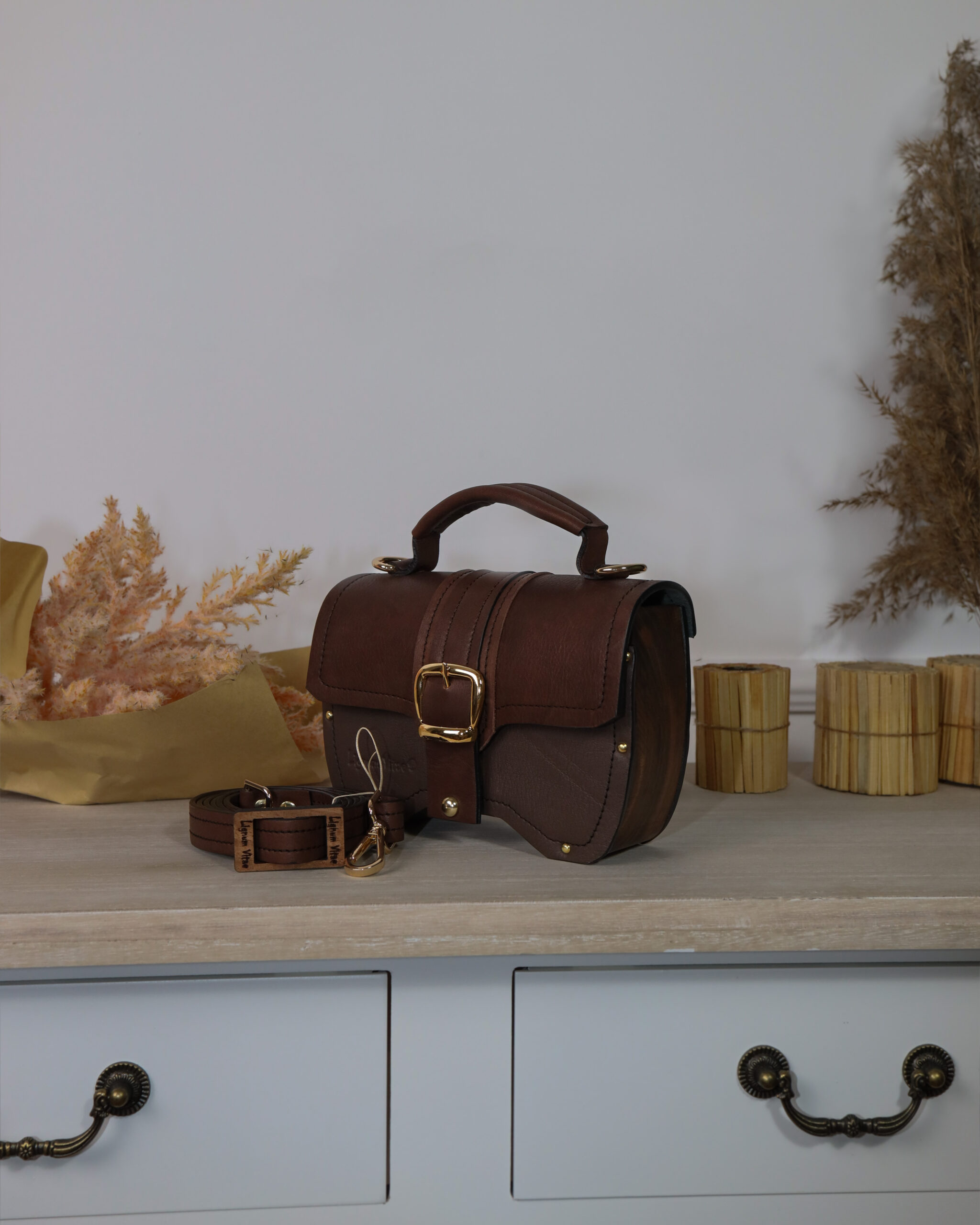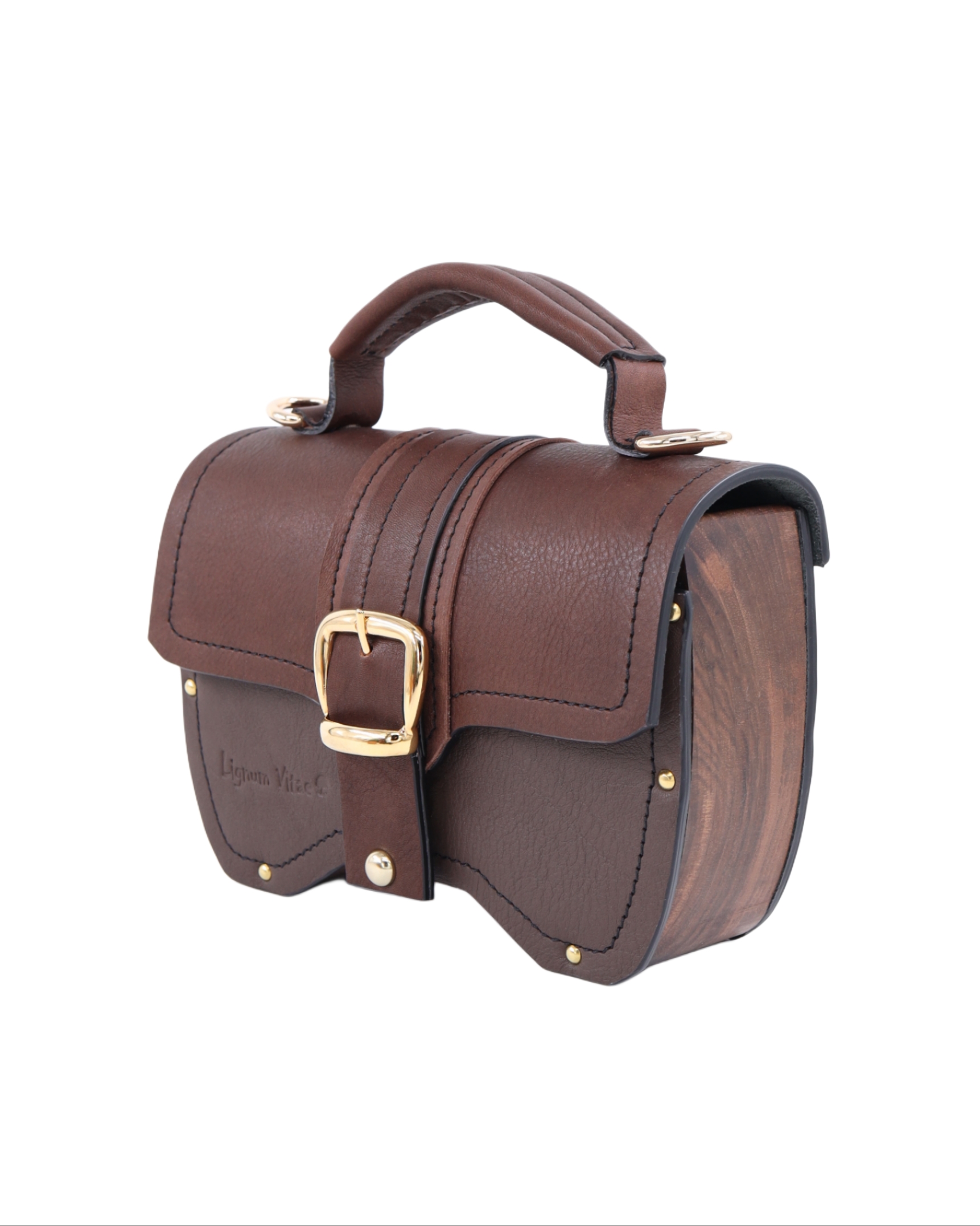 Deo naše timeless kolekcije. Minima, kao sto samo ime kaže, je mala torbice za osnovne stvari i za situacije kada želiš što manje stvari sa sobom i detalj koji će tvoj stil učiniti jedinsvenim. Neobičan oblik i elegantni metalni detalji sa 24karatnom pozlatom čine ovu torbicu jedinstvenim modnim komadom. Šivena ručica je tu tako da se može nositi u ruci ili na ramenu i crossbody pomoću kaiša sa drvenom šnalom za podešavanje dužine.