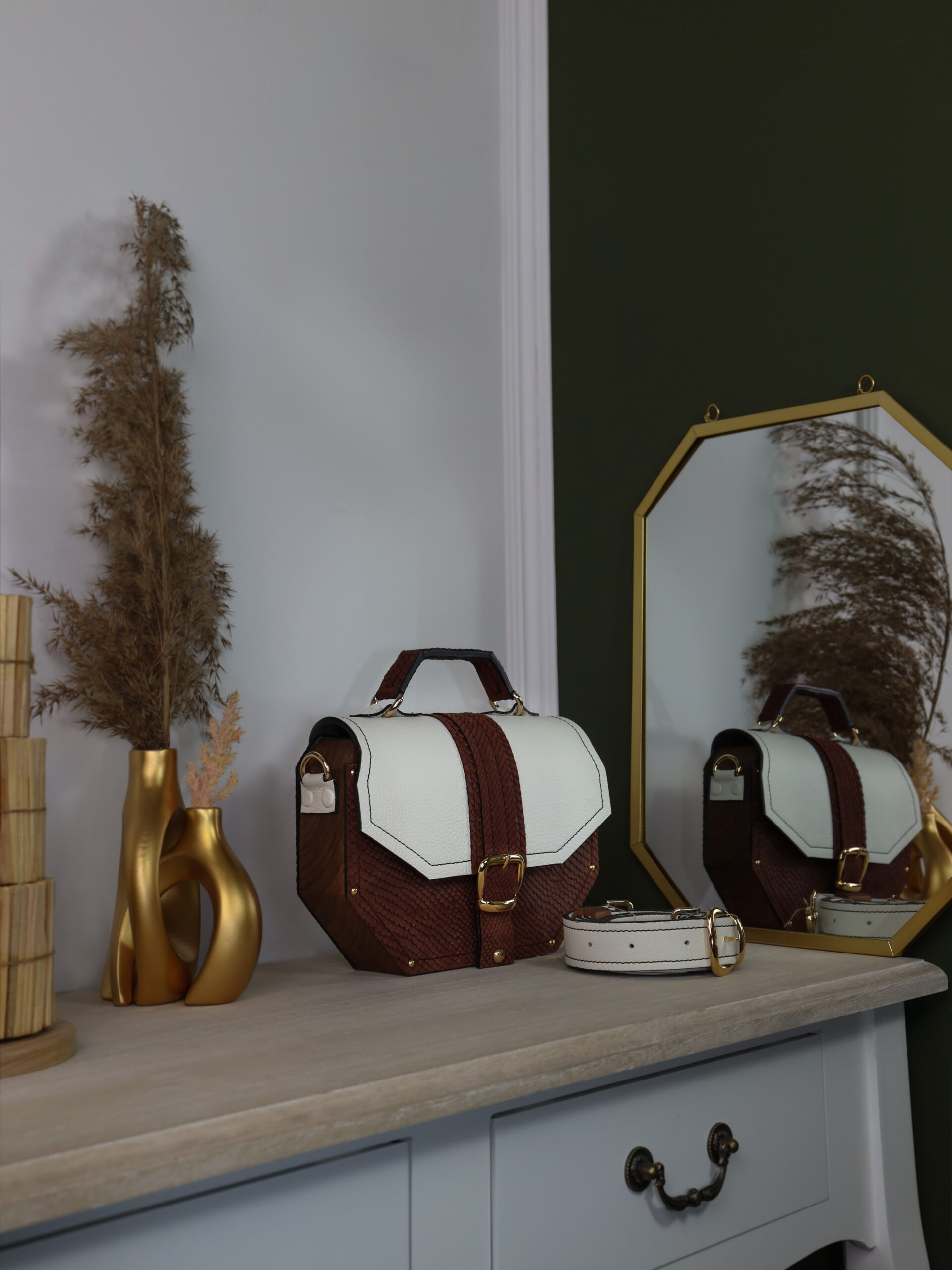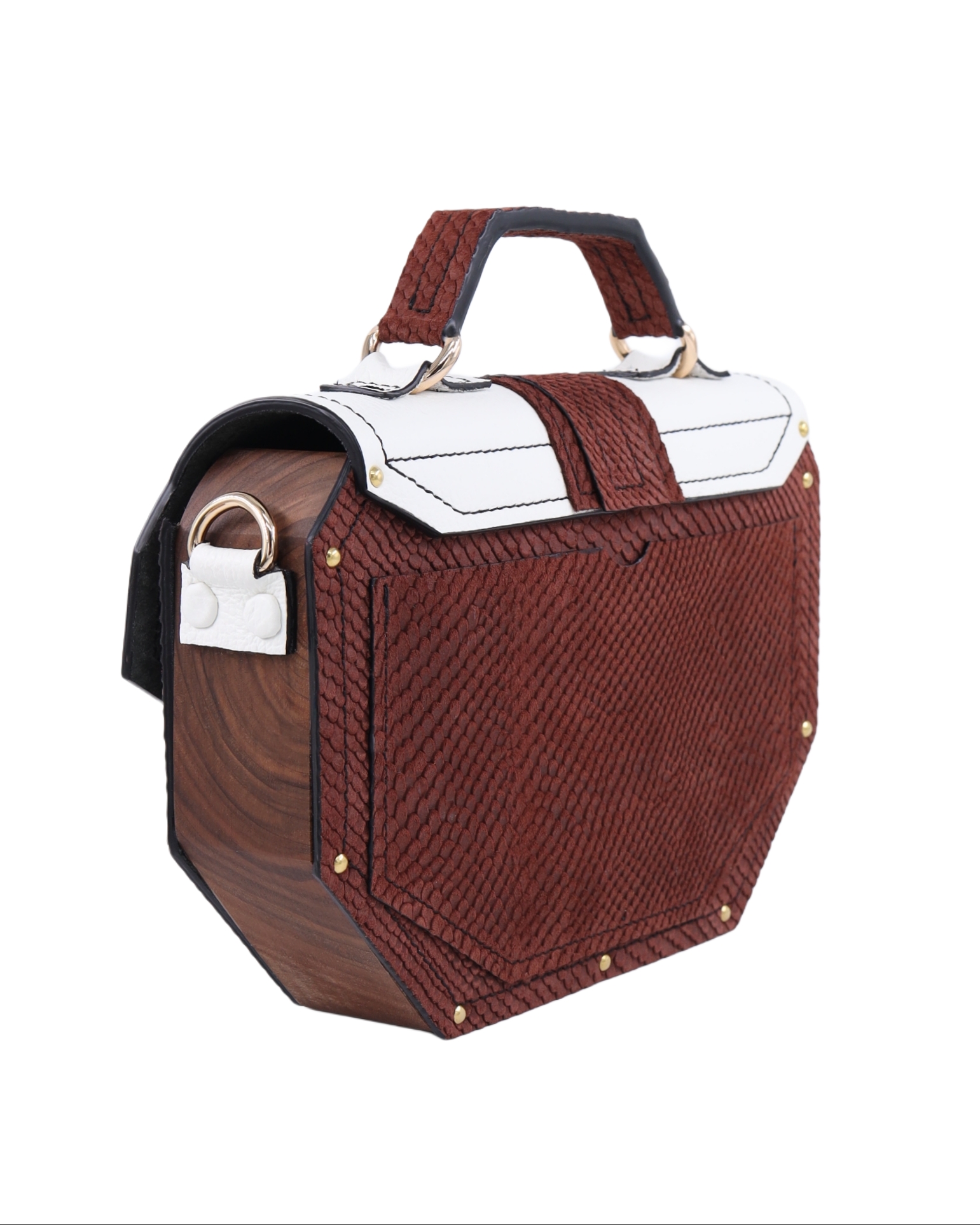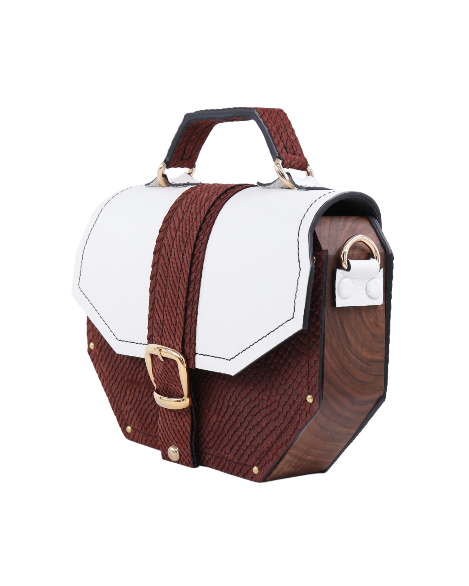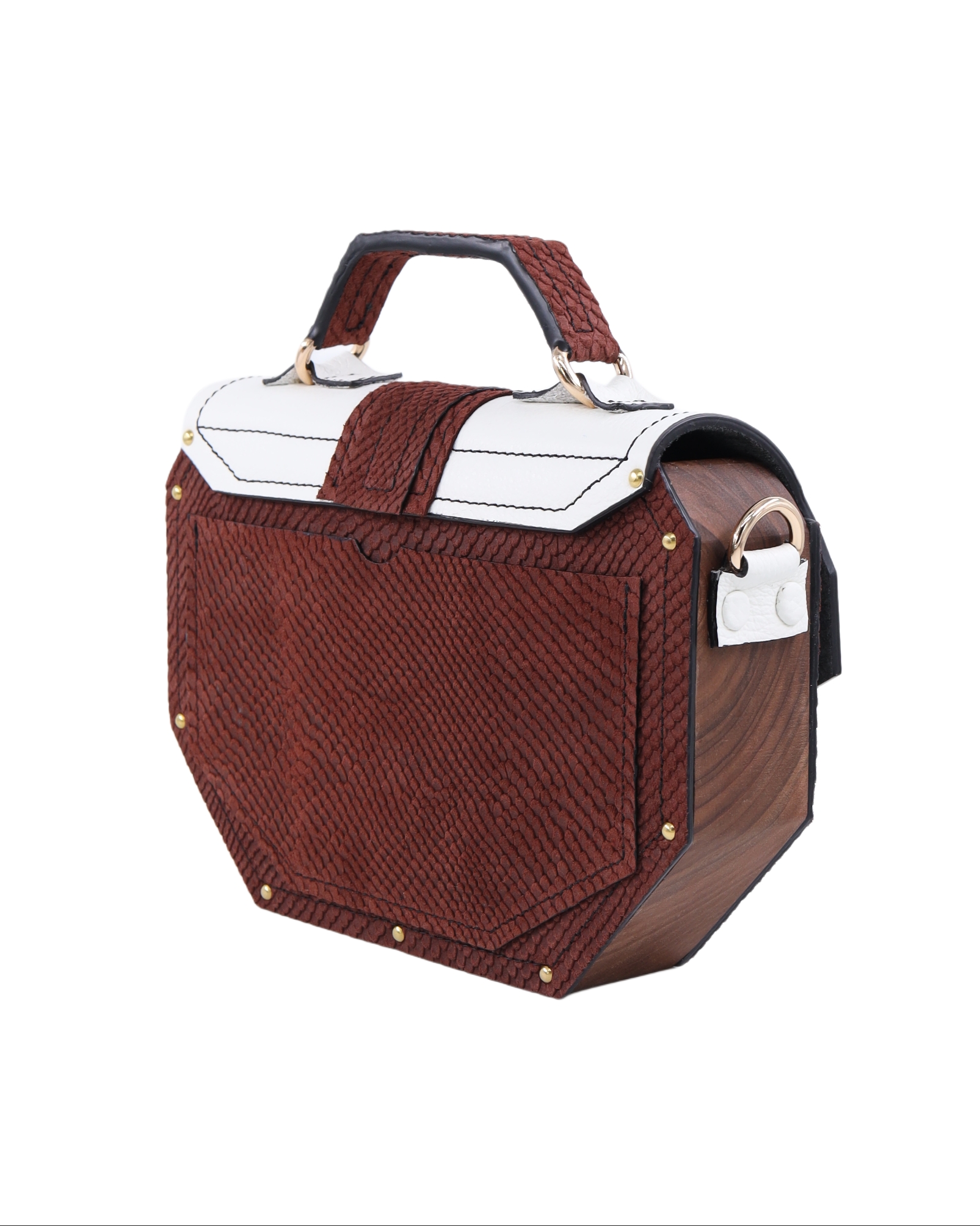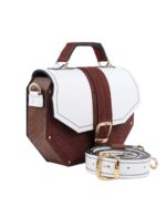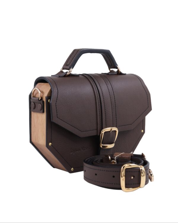Deo naše Timeless kolekcije. Neobičan oktagon dizajn odakle i njeno ime i metalni detalji sa 24karatnom pozlatom savršeno reprezentuje naš koncept torbi koje iskaču i šablona. Izrađena je od prirodne kože i drveta oraha iz jednog komada. Takodje, unutra je obložena prirodnom kožom. Džep na leđima torbe omogućava lak i brz pristup telefonu bez otvaranja torbe. Kožna šivena ručica sa oštrim uglovima prati oblik cele torbe. Torba se može nositi u ruci i uz pomoć kaiša sa podešavajućom dužinom na ramenu i crossbody.