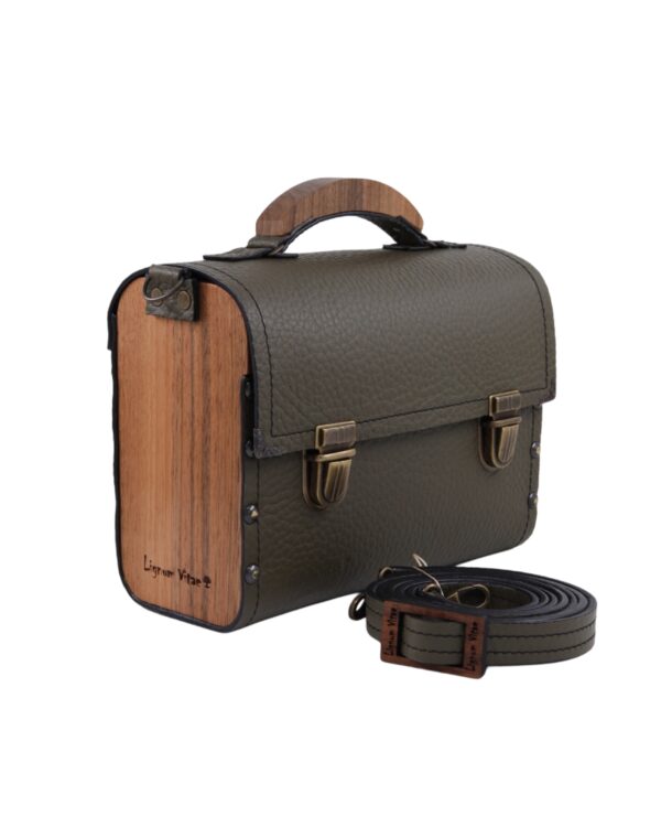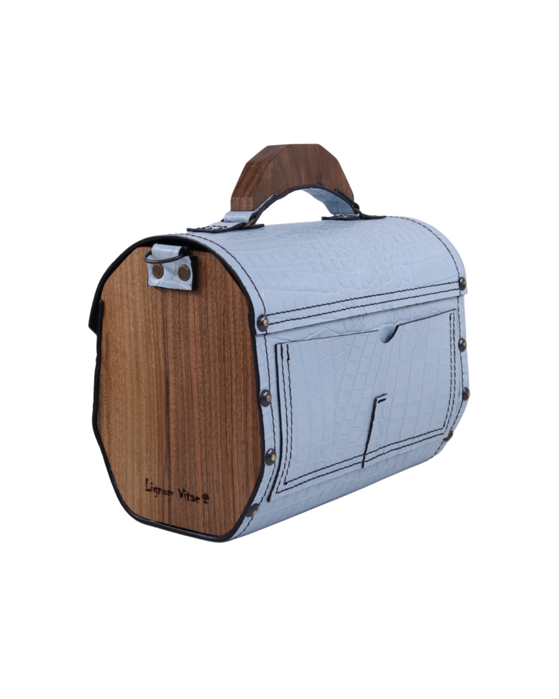 Izradjena je od najfinije, kroko Italijanske kože i odabranih komada drveta oraha na stranicama i ručici. Ostali materijali su metalne bravice, alkice i ekserici.