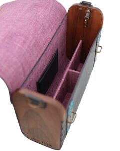Izradjena je od najfinije, čvrste reljefne Italijanske kože i odabranih komada drveta oraha na stranicama i ručici. Ostali materijali su metalne bravice, alkice i ekserici.