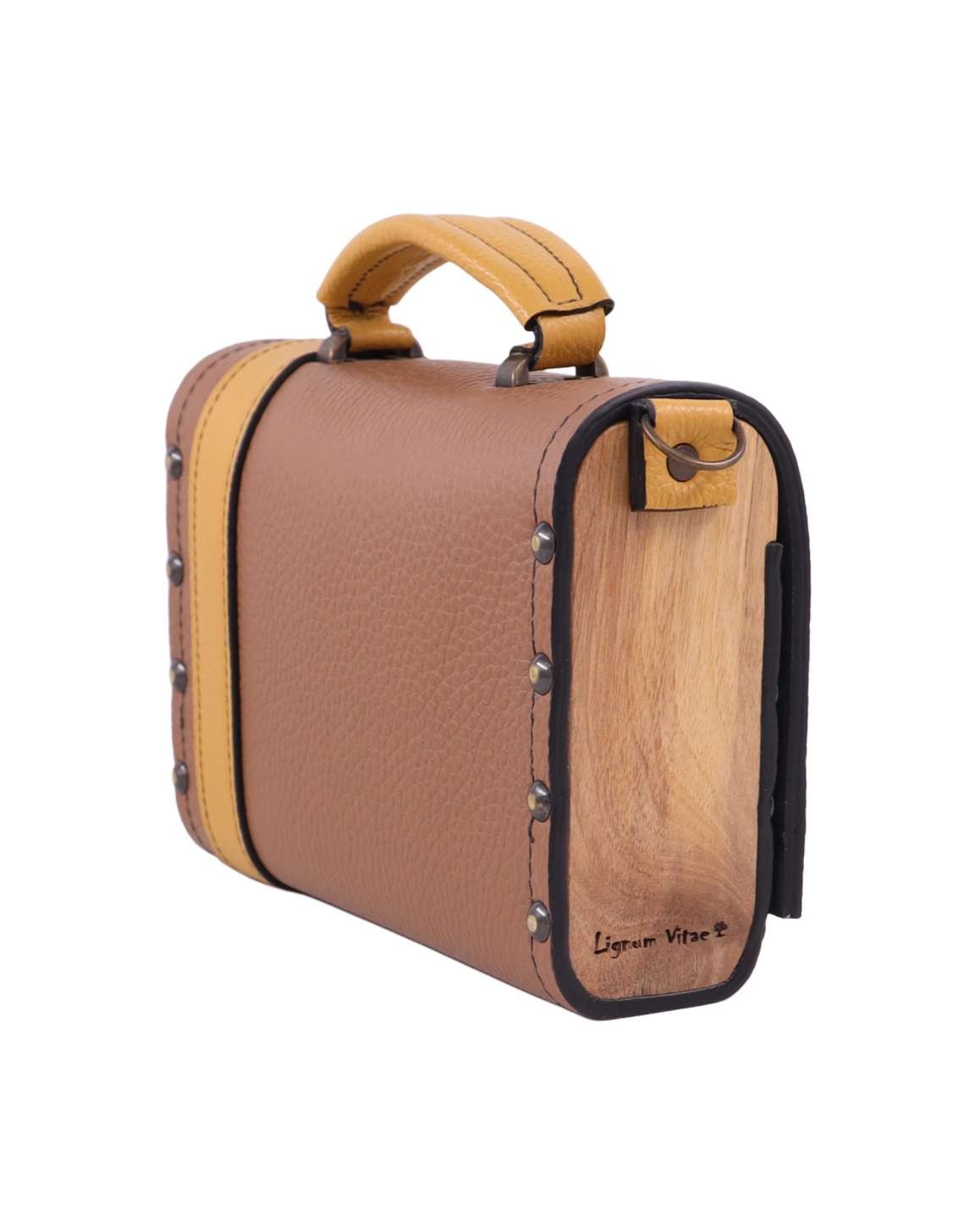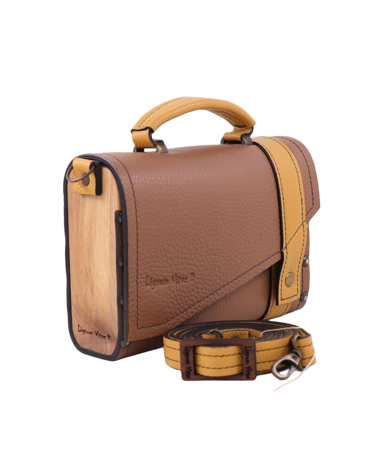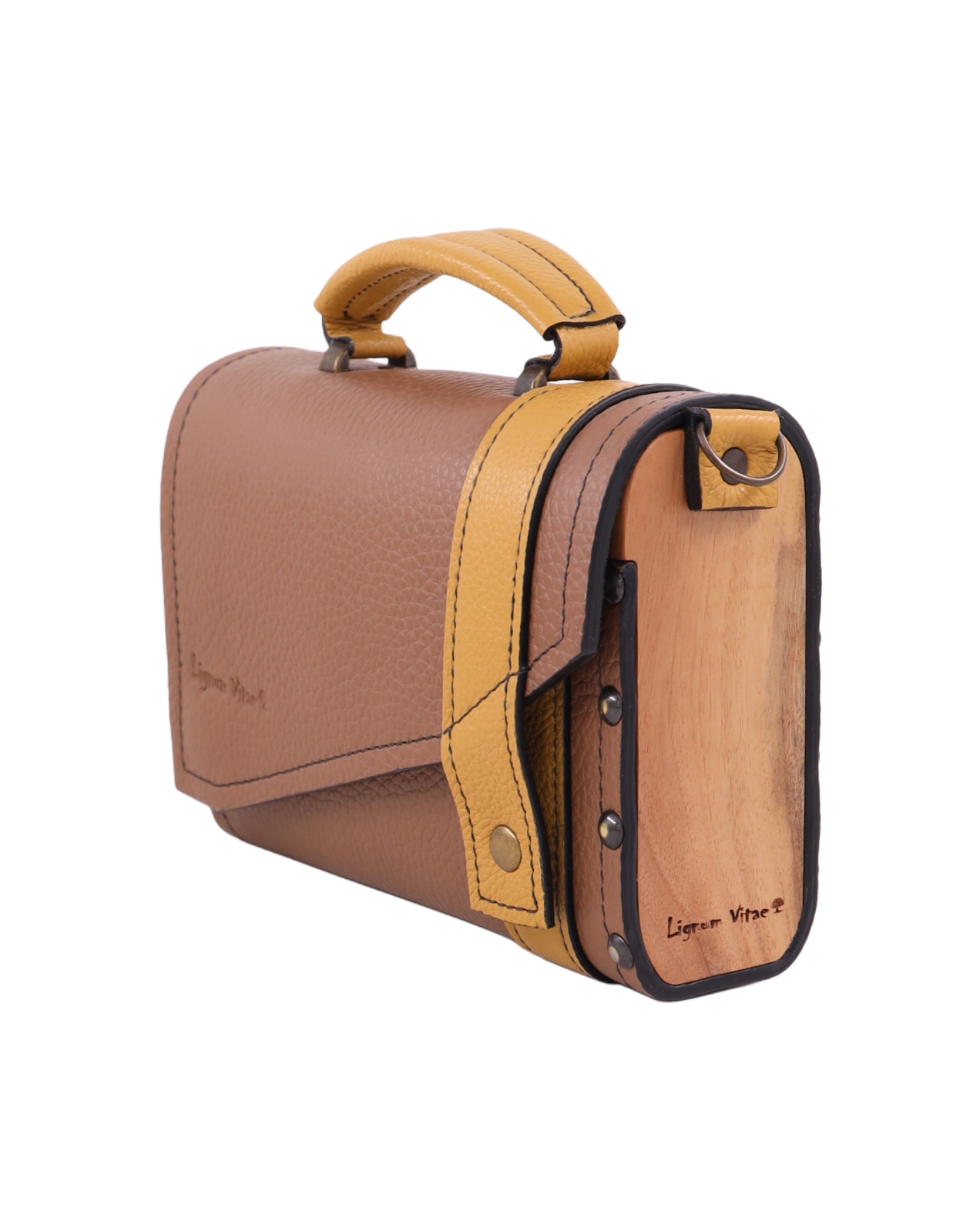 Mini remek delo iz naše radionice. Izrađena od prirodne kože i drveta torba sa kožnom ručicom koja daje njenom obliku dodatnu dimenziju. Unutrašnjost torbe je postavljena kožom a uz nju ide kožni kaiš sa našom tradicionalnom drvenom šnalom za podešavanje dužine . Stranice su izrađene od ultra-lakih komada finog orahovog drveta u veličini dovoljnoj za vaše osnovne stvari.Za sve ljubitelje malih torbica Ophelia je pravi izbor.