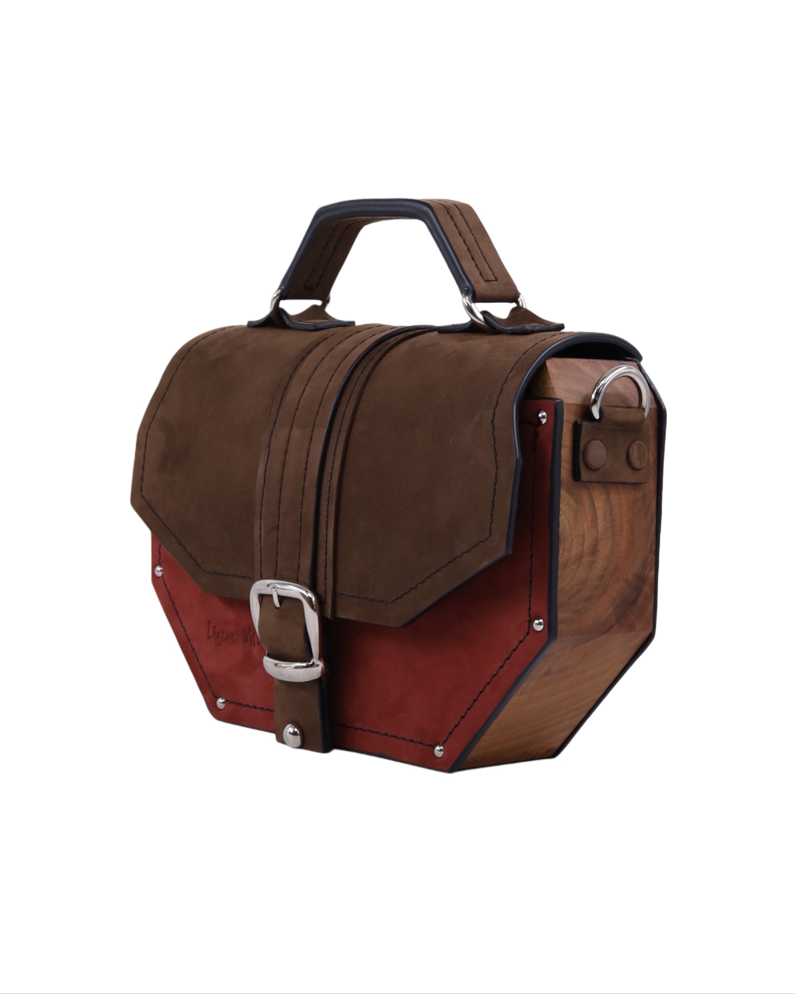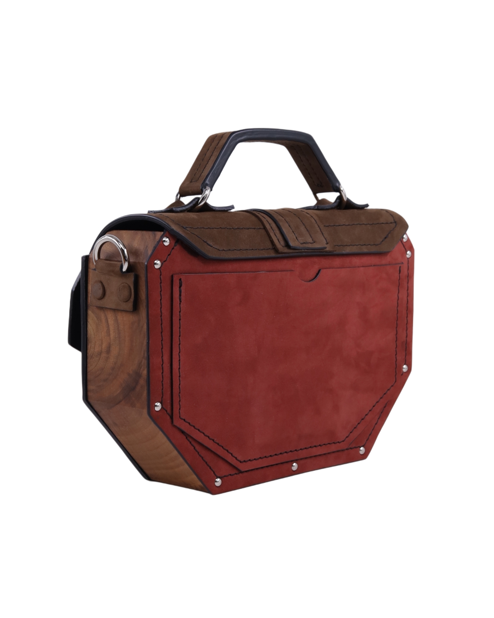 Deo naše Timeless kolekcije. Neobičan oktagon dizajn odakle i njeno ime i metalni detalji sa 24karatnom pozlatom savršeno reprezentuje naš koncept torbi koje iskaču i šablona. Izrađena je od prirodne kože i drveta oraha iz jednog komada. Takodje, unutra je obložena prirodnom kožom. Džep na leđima torbe omogućava lak i brz pristup telefonu bez otvaranja torbe. Kožna šivena ručica sa oštrim uglovima prati oblik cele torbe. Torba se može nositi u ruci i uz pomoć kaiša sa podešavajućom dužinom na ramenu i crossbody.