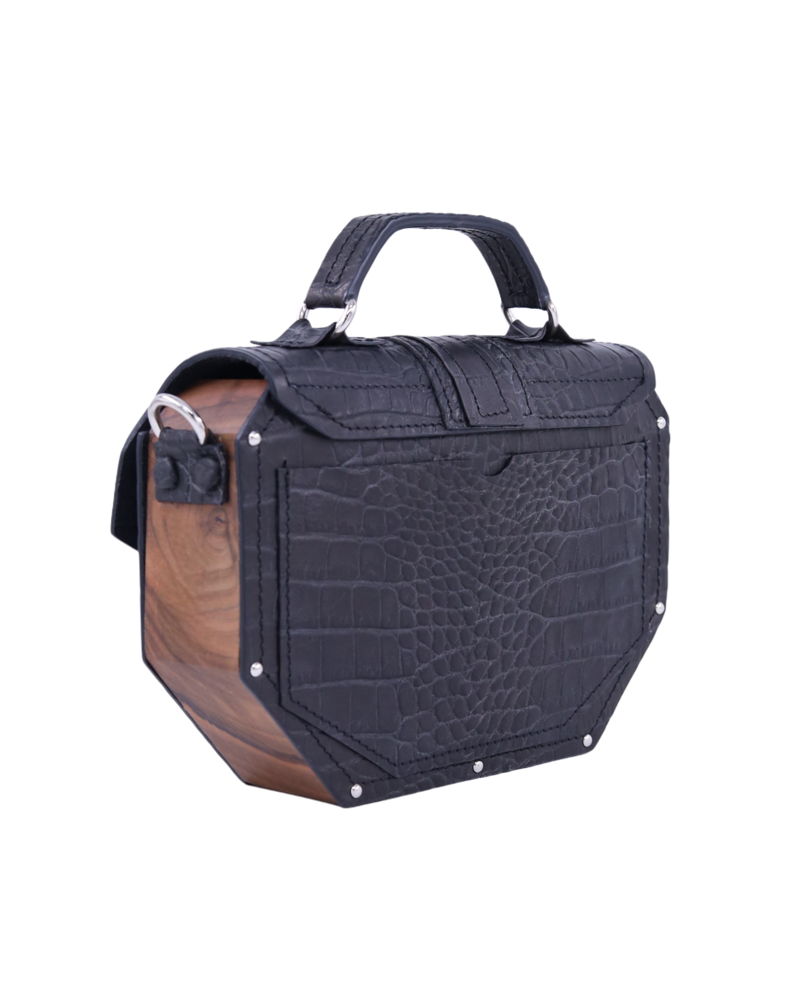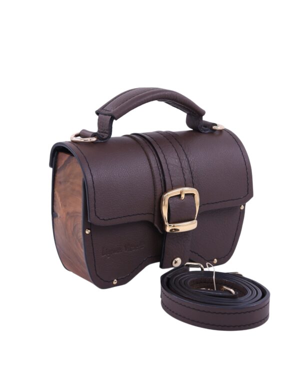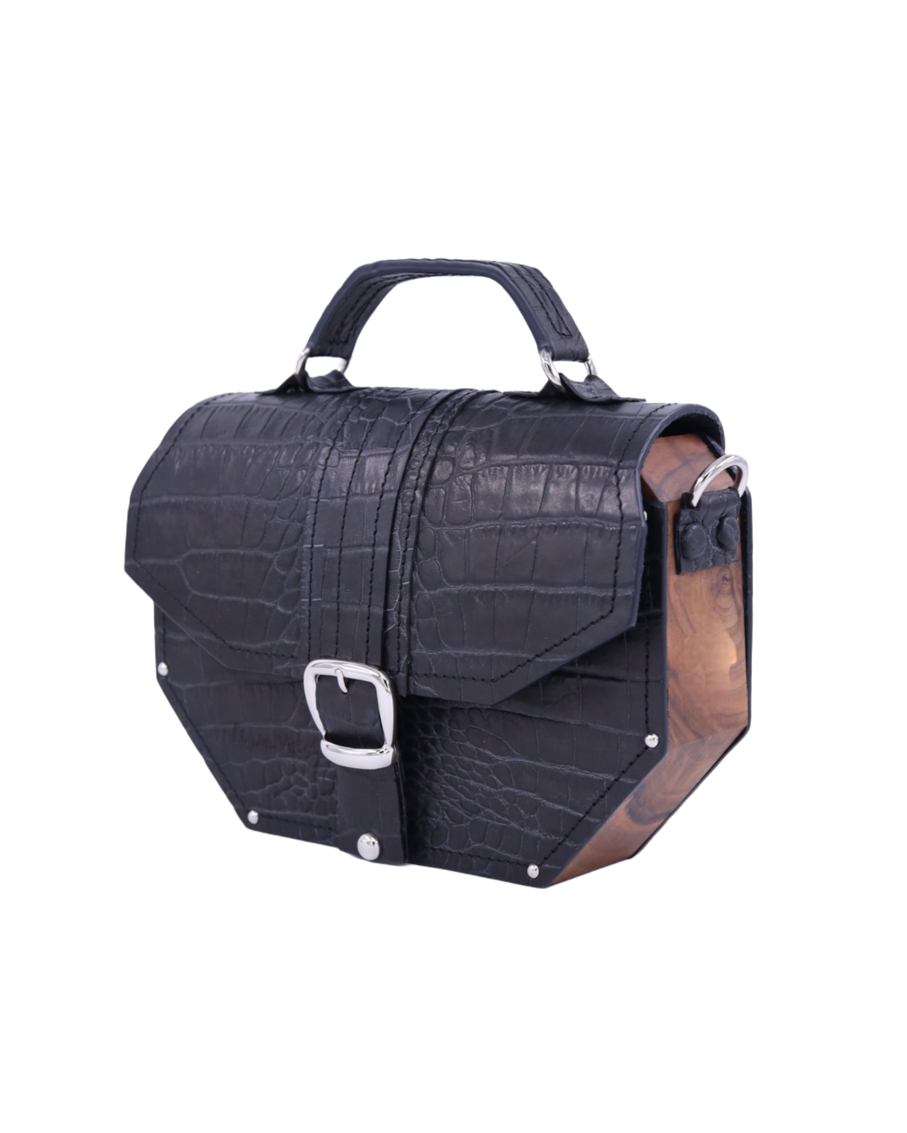 Deo naše Timeless kolekcije. Neobičan oktagon dizajn odakle i njeno ime i metalni detalji sa 24karatnom pozlatom savršeno reprezentuje naš koncept torbi koje iskaču i šablona. Izrađena je od prirodne kože i drveta oraha iz jednog komada. Takodje, unutra je obložena prirodnom kožom. Džep na leđima torbe omogućava lak i brz pristup telefonu bez otvaranja torbe. Kožna šivena ručica sa oštrim uglovima prati oblik cele torbe. Torba se može nositi u ruci i uz pomoć kaiša sa podešavajućom dužinom na ramenu i crossbody.