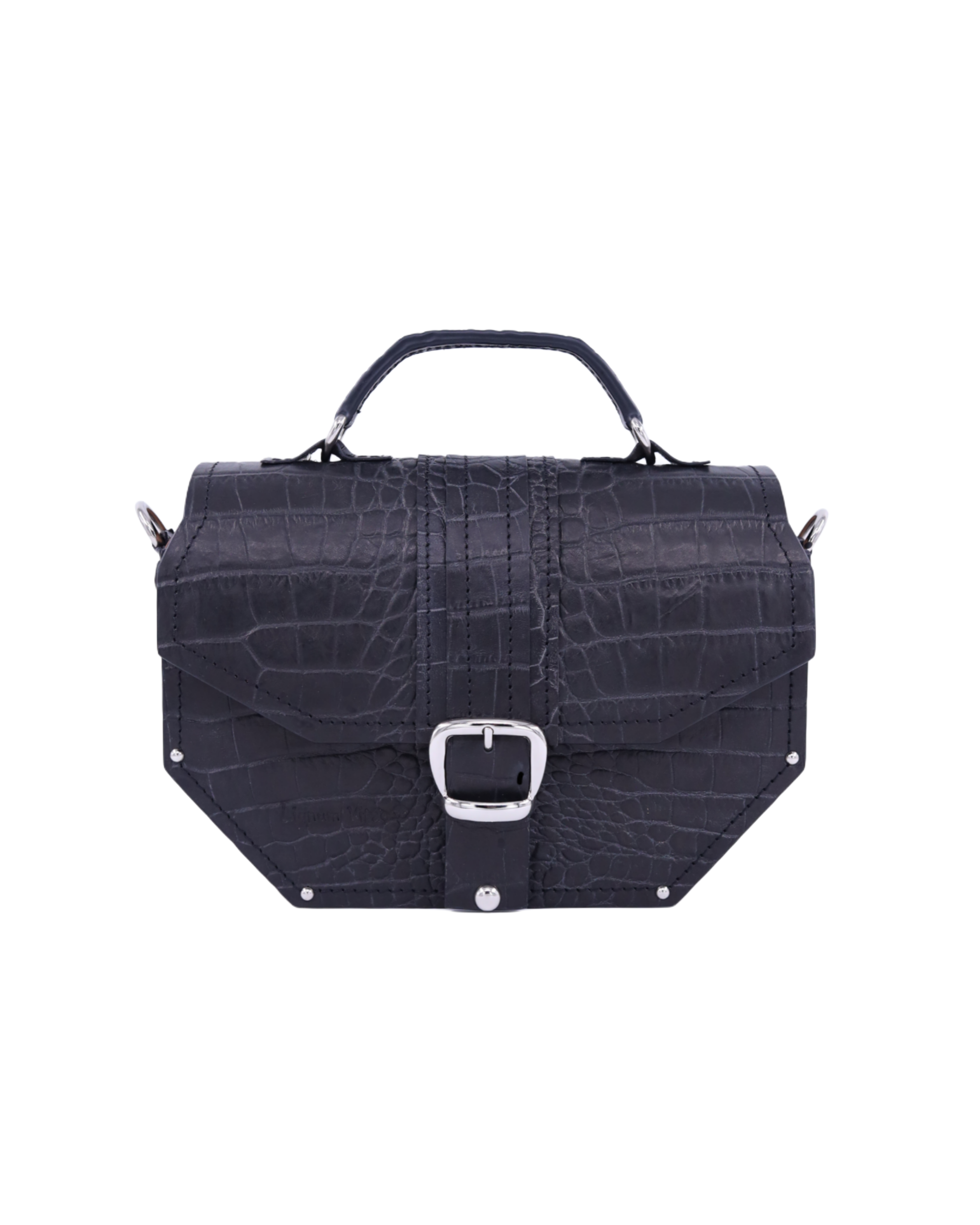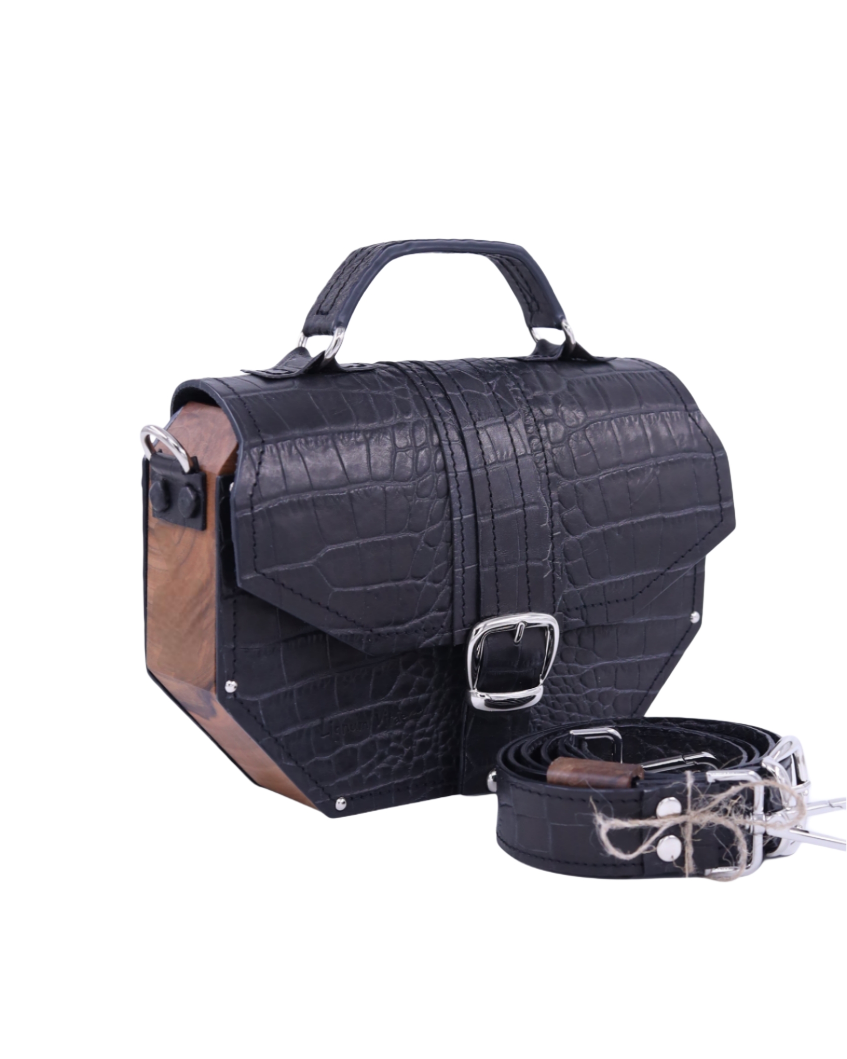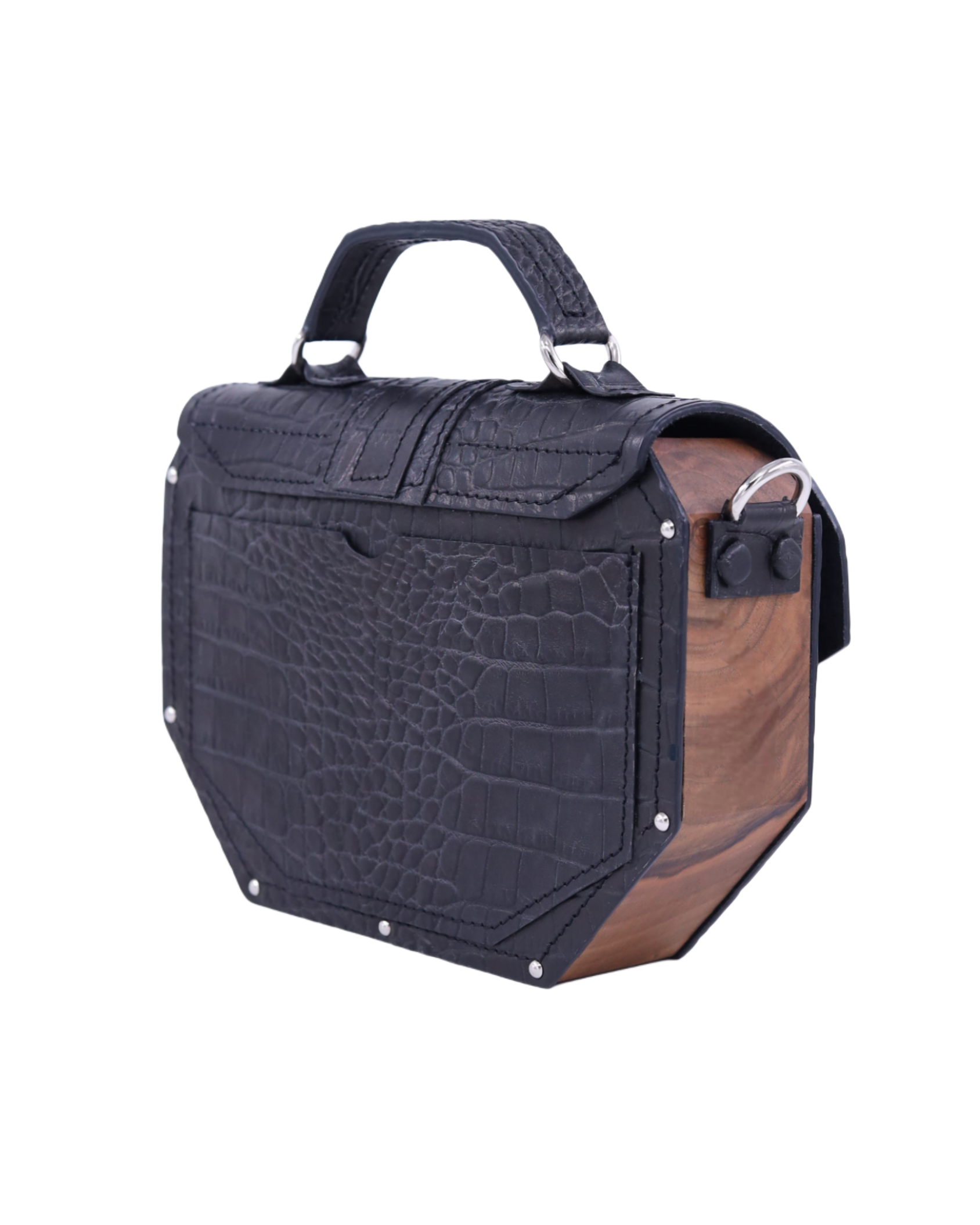 Deo naše Timeless kolekcije. Neobičan oktagon dizajn odakle i njeno ime i metalni detalji sa 24karatnom pozlatom savršeno reprezentuje naš koncept torbi koje iskaču i šablona. Izrađena je od prirodne kože i drveta oraha iz jednog komada. Takodje, unutra je obložena prirodnom kožom. Džep na leđima torbe omogućava lak i brz pristup telefonu bez otvaranja torbe. Kožna šivena ručica sa oštrim uglovima prati oblik cele torbe. Torba se može nositi u ruci i uz pomoć kaiša sa podešavajućom dužinom na ramenu i crossbody.